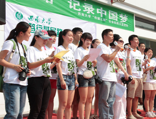 接下來他們將分散調(diào)研,通過拍攝和征集100組生動、鮮活、感人的“老百姓的中國夢”圖片,傾聽、記錄、分析老百姓對“中國夢”的理解,以及對地方發(fā)展的建議和對城市建設(shè)的意見...詳情>>> 7月4日上午,熱情盛夏,流光溢彩。歇馬鎮(zhèn)碚青路中心廣場上人頭攢動、歌聲飛揚、掌聲不斷、熱鬧非凡。西南大學(xué)“傳媒之眼”服務(wù)隊的志愿者同學(xué)在這里舉行“篤行基層路,記錄中國夢”為主題的文藝匯演。