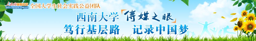 西南大學(xué)“傳媒之眼”社會實踐隊由新聞傳媒學(xué)院團委老師李海峰、范曦帶隊,8名研究生、19名本科生組成。團隊圍繞“篤行基層路,記錄中國夢”的主題,自7月3日開始,從建設(shè)生態(tài)北碚、“百姓中國夢”主題宣講、“幸福重慶”人文記錄、“山城百姓”社會調(diào)查四個方面開展活動。團隊已經(jīng)在歇馬鎮(zhèn)碚青路中心廣場舉行了文藝匯演,并給群眾帶來了各種各樣的避暑藥品;到歇馬污水處理廠,了解當?shù)厣a(chǎn)生活污水的處理;到重慶歇馬機械曲軸有限公司,宣傳“節(jié)能生產(chǎn)”理念,在員工中開展環(huán)保培訓(xùn),強調(diào)可持續(xù)生產(chǎn)和發(fā)展。