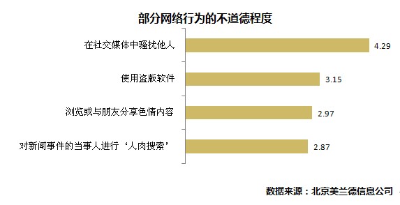 哪些行為在網(wǎng)絡(luò)世界中最不道德?調(diào)查顯示,“在社交媒體中騷擾他人”被認(rèn)為最不道德;其次是“使用盜版軟件”;“瀏覽或與朋友分享色情內(nèi)容”以及“對(duì)新聞事件當(dāng)事人進(jìn)行人肉搜索”這兩項(xiàng)行為被認(rèn)為處于“一般”和“輕微不道德”之間。