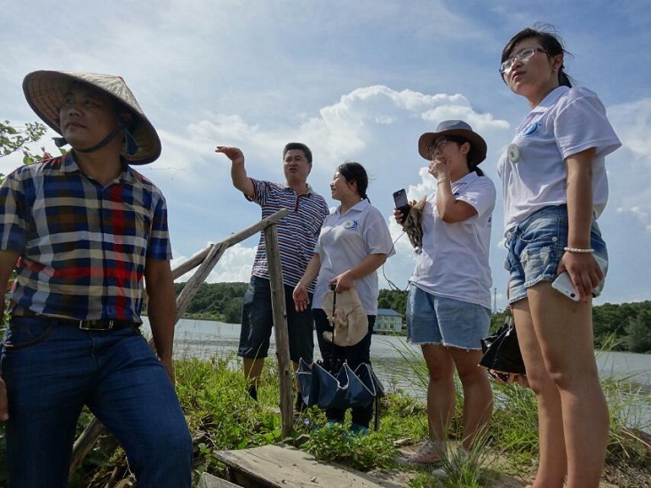 同一時間,團隊的女生頂著毒辣的日頭趕到防城港,與廣西紅樹林研究中心珍珠灣野外工作站的鐘云旭站長、羅硯科長共同參觀生態(tài)養(yǎng)殖基地,了解基地目前的養(yǎng)殖及收獲狀況。目前該基地在魚類養(yǎng)殖中已取得部分成效,并已實現(xiàn)了半生態(tài)的養(yǎng)殖。