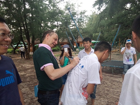 外國友人表示愿意參加到保護紅樹林的行動中來,在隊服上簽上自己的名字