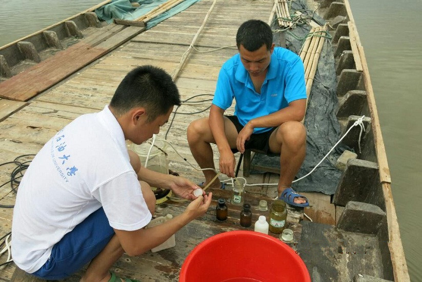 7月10日,團(tuán)隊(duì)聯(lián)合廣西海洋研究所紅樹(shù)林研究中心對(duì)欽江東西支流進(jìn)行水樣調(diào)查,這是此次活動(dòng)中的重要工作。6名男生在船上和工作人員一同工作了26個(gè)小時(shí),協(xié)助工作人員進(jìn)行水樣采集與固定,流速與流向測(cè)定,水深測(cè)定及GPS定位等,從中也學(xué)到了很多海洋知識(shí)。
