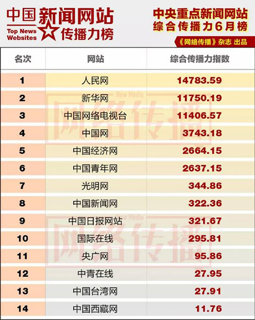 中國新聞網(wǎng)站傳播力榜發(fā)布 人民網(wǎng)位居央網(wǎng)首位