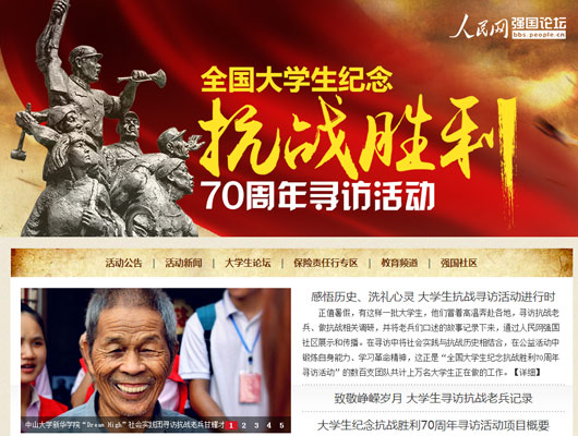 本次活動(dòng)吸引了來(lái)自全國(guó)200多所高校的800支大學(xué)生團(tuán)隊(duì)報(bào)名,大學(xué)生們尋訪抗戰(zhàn)老兵,聆聽抗戰(zhàn)故事,重走抗戰(zhàn)遺址,調(diào)研人文歷史,感悟革命精神。各團(tuán)隊(duì)實(shí)踐期間在人民網(wǎng)強(qiáng)國(guó)社區(qū)大學(xué)生論壇實(shí)時(shí)播報(bào)實(shí)踐進(jìn)程,發(fā)回稿件數(shù)千篇。浙江大學(xué)一位學(xué)生在實(shí)踐總結(jié)中說(shuō):“我們的活動(dòng)通過(guò)人民網(wǎng)的平臺(tái)得到了更多媒體的關(guān)注,讓更多的人關(guān)注到關(guān)愛(ài)抗戰(zhàn)老兵行動(dòng),這個(gè)暑假?zèng)]有白過(guò),真的很有意義!”