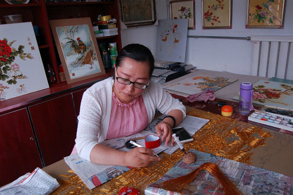 “因為喜歡”,簡簡單單四個字,卻有著震撼人心的力量,蘭州理工大學(xué)“問藝社”的同學(xué)們走進古香古色的工作室,見到了掐絲畫藝人高芬平。她曾擁有穩(wěn)定的教師工作,只因?qū)ζz畫的無限喜愛而辭職走上了艱難辛苦的從藝之路。如今的她是一位掐絲畫高級工藝師,正在制作靜寧特色掐絲畫——絲綢之路,巨幅畫作幾乎和她一樣高。在明媚陽光的工作室里,她享受著自己忙碌中的寧靜。