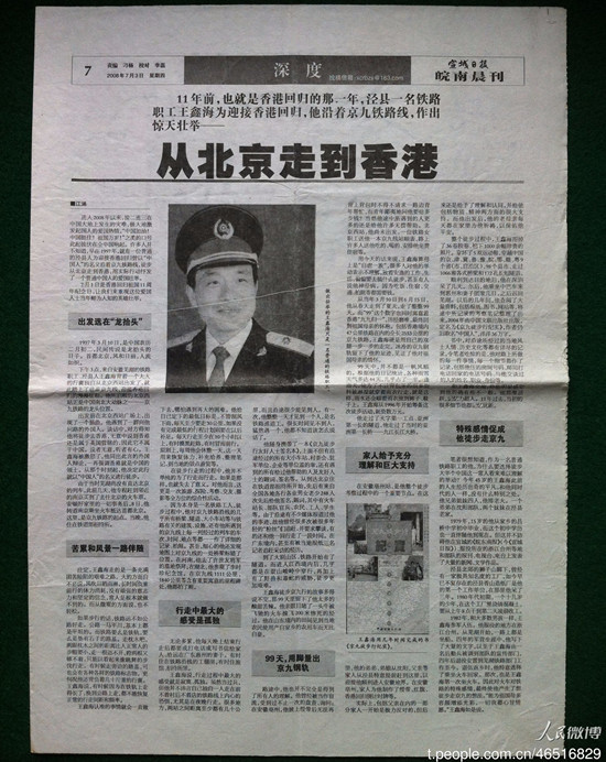 1997年對(duì)中國(guó)人來(lái)說(shuō),是難忘的一年。香港終于結(jié)束了英國(guó)殖民地身份,回歸祖國(guó)懷抱。為迎接這一歷史性時(shí)刻,1997年3月10日下午3點(diǎn),安徽蕪湖鐵路職工、涇縣人王鑫海背起一個(gè)大大的行囊獨(dú)自從北京西站出發(fā),踏上徒步京九線(xiàn)、迎接香港回歸的漫漫征程。
