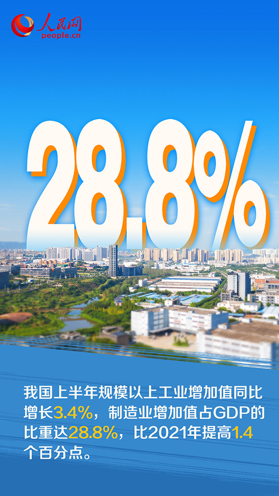 上半年,在各地區(qū)各部門(mén)共同努力下,盡管面臨疫情沖擊,產(chǎn)業(yè)鏈供應(yīng)鏈日益穩(wěn)定暢通,工業(yè)經(jīng)濟(jì)迅速扭轉(zhuǎn)了下滑態(tài)勢(shì),實(shí)現(xiàn)了恢復(fù)增長(zhǎng)。國(guó)新辦7月19日舉行發(fā)布會(huì)介紹,今年上半年,我國(guó)規(guī)模以上工業(yè)增加值同比增長(zhǎng)3.4%,規(guī)模以上制造業(yè)增加值同比增長(zhǎng)2.8%,制造業(yè)增加值占GDP的比重達(dá)28.8%,比2021年提高1.4個(gè)百分點(diǎn)。