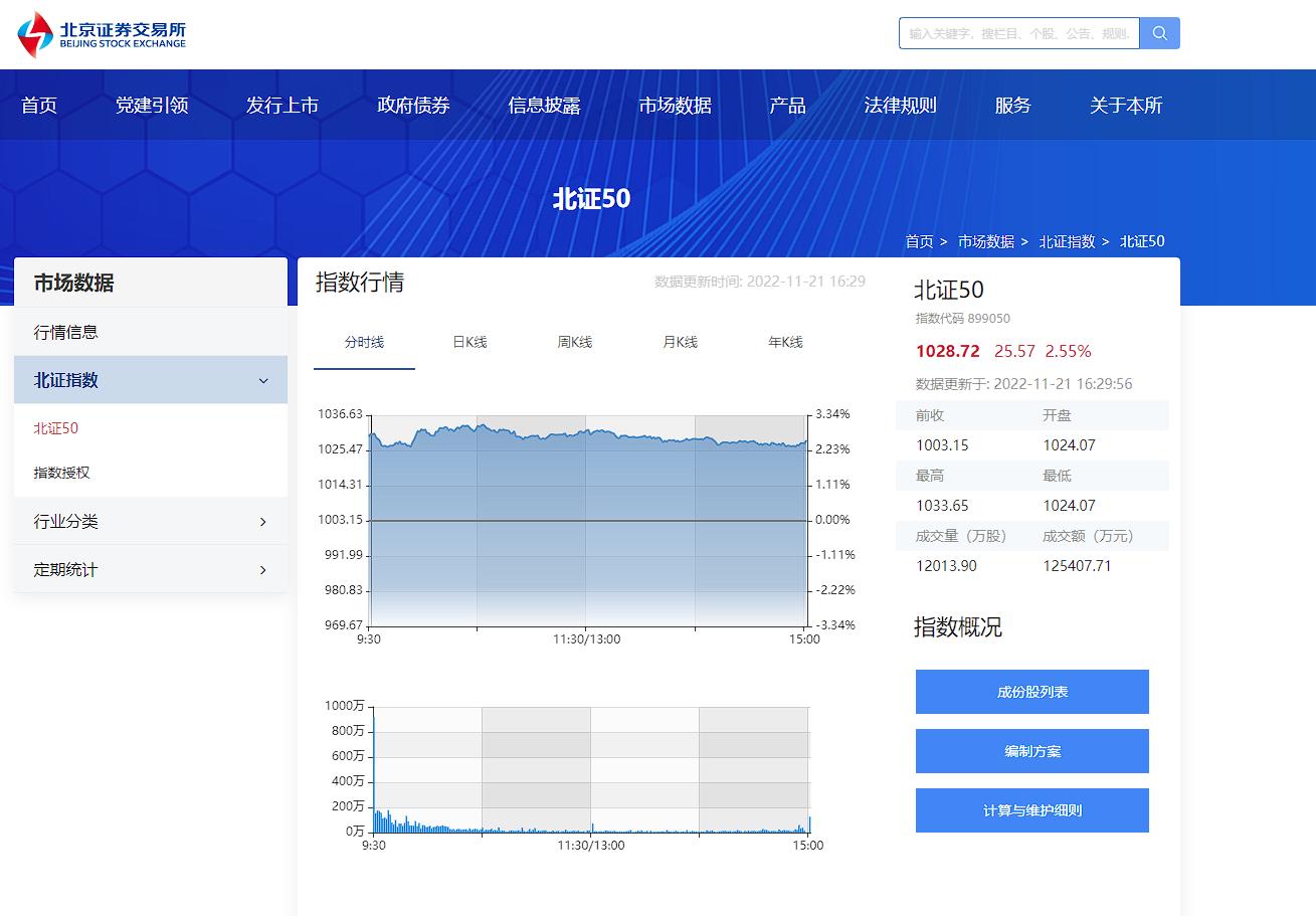 北交所首個指數(shù)——北證50成份指數(shù)(簡稱北證50)于11月21日正式發(fā)布實(shí)時行情。上線首日,北證50收盤上漲2.55%,報1028.72點(diǎn),開盤后走勢平穩(wěn),樣本股成交活躍,提高了整個市場活躍度。據(jù)了解,北證50以2022年4月29日為基日,基點(diǎn)為1000點(diǎn)。