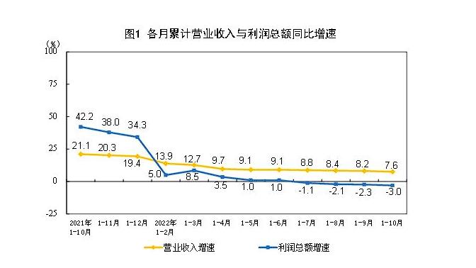 國(guó)家統(tǒng)計(jì)局?jǐn)?shù)據(jù)顯示,今年前10個(gè)月,全國(guó)規(guī)模以上工業(yè)企業(yè)營(yíng)業(yè)收入同比增長(zhǎng)7.6%,利潤(rùn)同比下降3%。國(guó)家統(tǒng)計(jì)局工業(yè)司高級(jí)統(tǒng)計(jì)師朱虹解讀工業(yè)企業(yè)利潤(rùn)數(shù)據(jù)時(shí)表示,總體看,工業(yè)企業(yè)利潤(rùn)下降,結(jié)構(gòu)繼續(xù)改善,部分中下游行業(yè)利潤(rùn)回升明顯。但也要看到,近期國(guó)內(nèi)疫情散發(fā)多發(fā),世界經(jīng)濟(jì)衰退風(fēng)險(xiǎn)加劇,工業(yè)企業(yè)效益恢復(fù)面臨較大壓力。